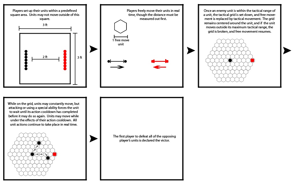 This project was created for Junior Year’s Game Systems and Experience Design class. The principle behind this system was to attempt to marry large scale strategic play seen in games such as Starcraft or Age of Empires, with the precise tactical gameplay of games such as Final Fantasy Tactics or Fire Emblem. Though the system is not designed for the sheer number of troops often seen in Starcraft games, a well-designed and responsive interface and controls would allow players to easily control larger number of units. Essentially, the system revolves around the concepts of ‘free-space’–RTS-style rules and movements–and ‘grid-space’–turn-based tactics rules and movement. Overall troop management is controlled via ‘free-space’ rules, but when a unit is within a certain distance of an opposing unit, ‘grid-space’ rules apply. The full system can be seen below.