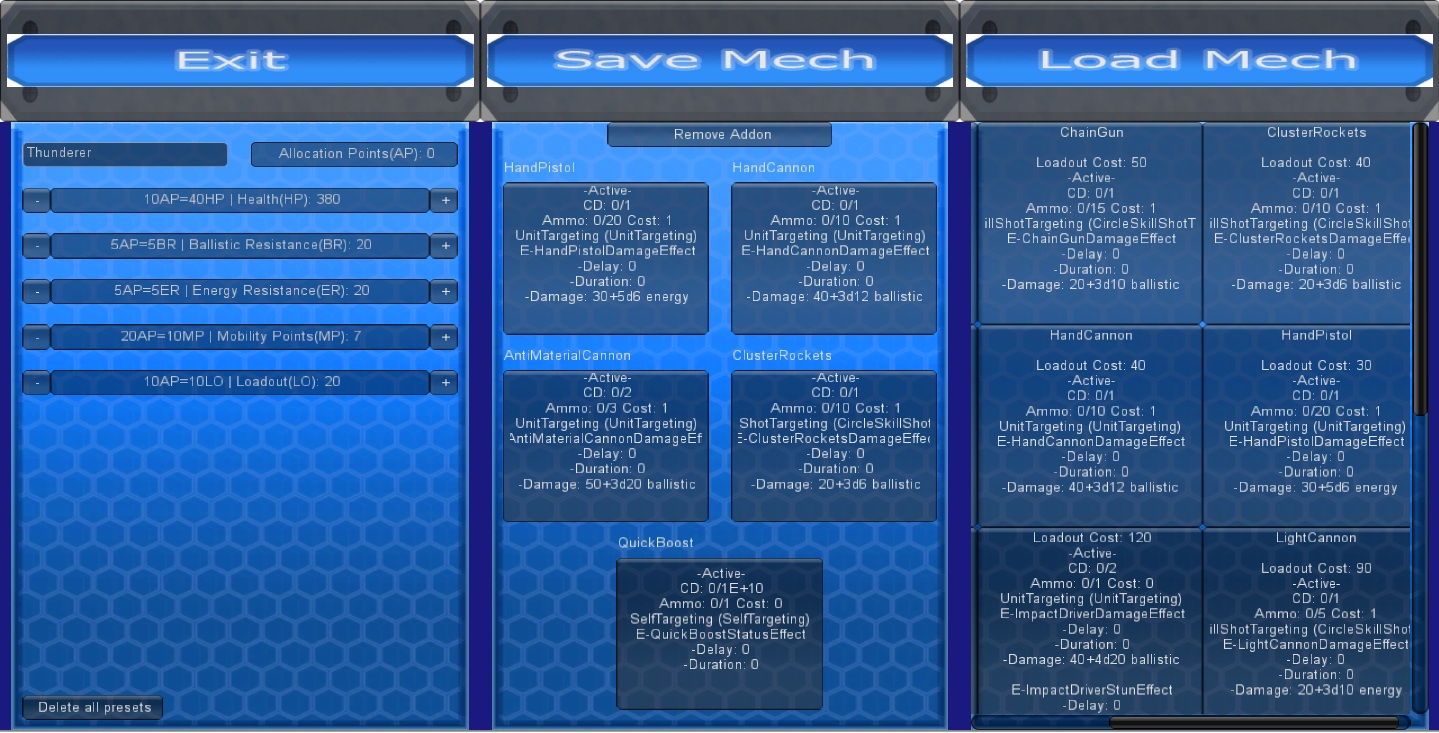 Special abilities were a key component when it came to balancing the weapons. Longer range weapons are innately more powerful, as they would allow players to attack with little fear of retaliation, especially on mechs with high mobility–likewise, a weapon with an AoE attack type would not only have greater range, but be capable of a higher relative damage output when used against multiple targets. As weapons deal a total of base and random damage, it was important to take into consideration abilities that could inflict one of these styles of damage. Take for example, a weapon that deals 40 base damage plus 3d20 random damage (meaning it deals 3 to 60 damage, which is then added to the base damage). If the weapon has an ability that deals its base damage twice, it will on average, be more powerful than if its random damage is rolled twice. However, in the case of the latter, it does have a chance of greatly out-damaging the former, and its power level must reflect this understanding.