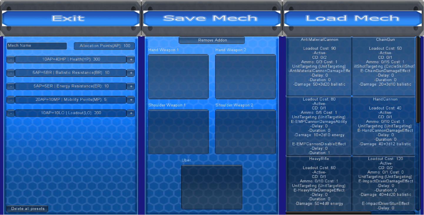Full Metal Tactics is a multiplayer turn-based strategy, tabletop style game created in Unity 3.5 and intended for tablet devices. The game was a group project created for senior year’s Senior Capstone in Game Development class, but was not selected for Senior Production. Players are able to create the mech they’ve always wanted, customizing first its base stats, and then its arsenal of weapons, before jumping into the battlefield to destroy their enemies.